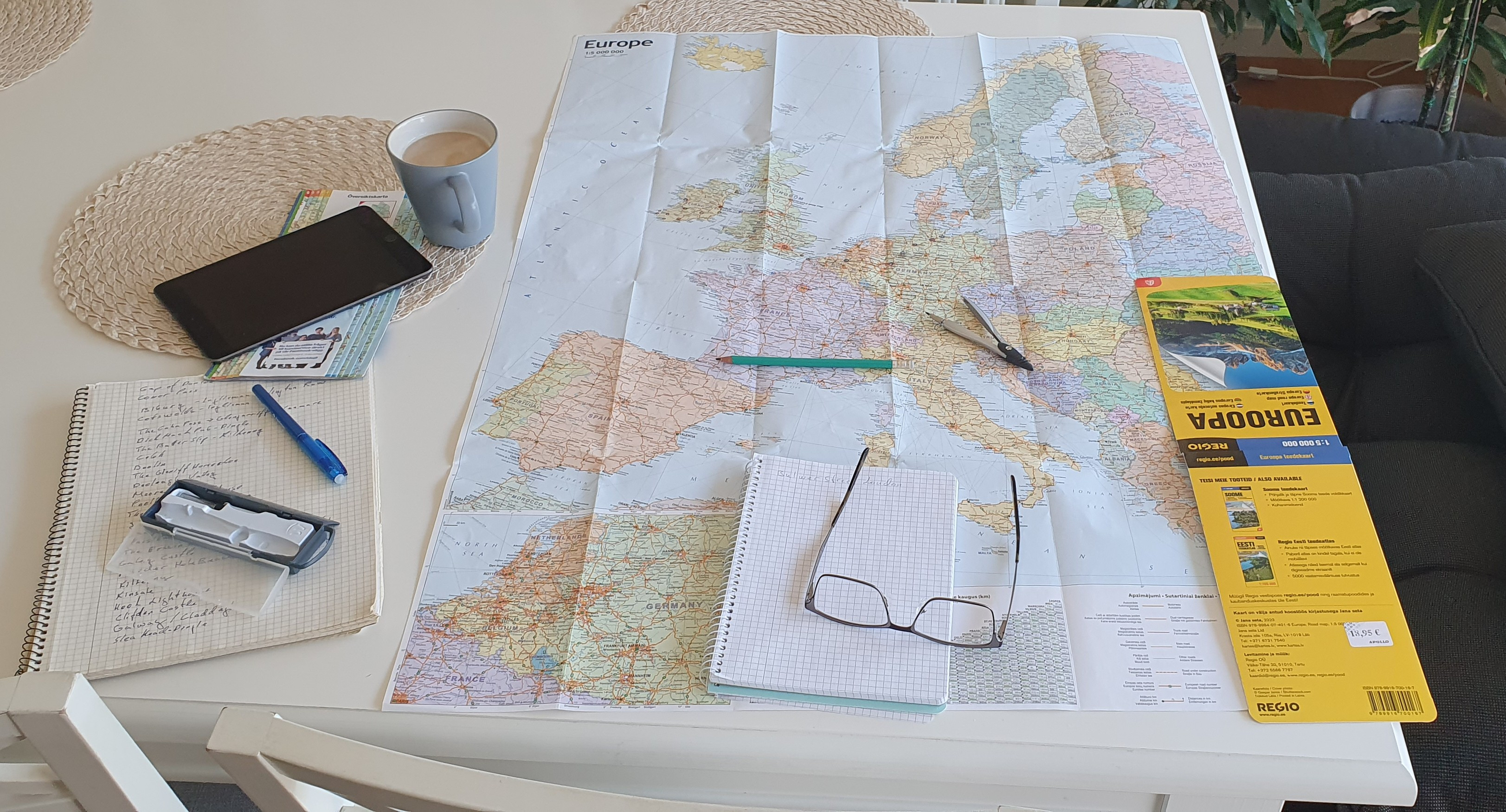 Oma ettekujutuses võtsin ma ette kaardi ning laevalogi täpsusega kandsin teekonna kaardile. Praktikas see nii sujuv algus muidugi polnud, sest esimeseks takistuseks osutus paberkaardi leidmine. Pole just palju neid butiike, kus sellist arhailist inventari leida. Uus aeg soosib uusimaid lahendusi GPS, navi, telefonis, eraldi seadmetes jms. Aga minu jaoks need kuigi ahvatlevad pole. Töökindluse mõttes ehk jah, kuid teekonna planeerimisel ja tervikliku ylevaate osas kasinad. Viimaks siiski õnnestus leida Apollo raamatupoe kaugemast servast riiul, kus muude reisikirjade vahelt paistis maakaardi kollakas serv, kirjaga - Euroopa. See sobis. Hind 13,95 EUR